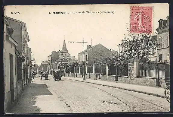 AK Montreuil, la rue de Vincennes (la Tourelle) avec calèche et passants