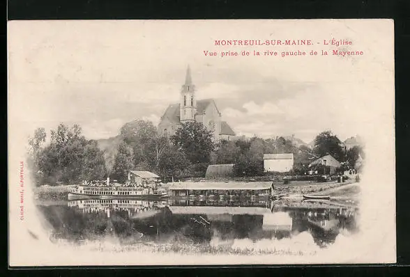AK Montreuil-sur-Maine, L`Eglise, Vue prise de la rive gauche de la Mayenne