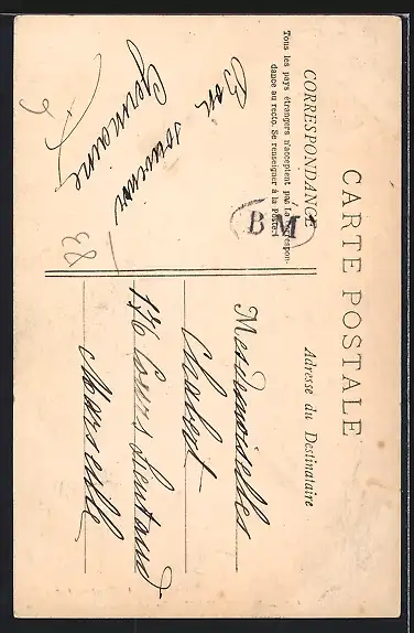 Personenbezogene Daten auf der Rückseite der Karte wurden durch blauen Textmarker unkenntlich gemacht. Die blauen Stellen sind auf die Vorderseite durchgeweicht und wirken sich negativ auf das Postkartenfoto aus