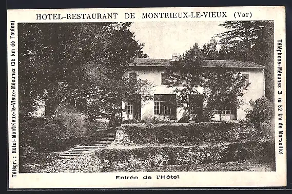 AK Montrieux-le-Vieux, Entrée de l`Hôtel-Restaurant entourée de verdure