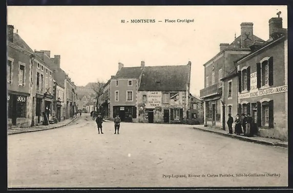 AK Montsurs, Place Crouligné animée avec bâtiments et passants
