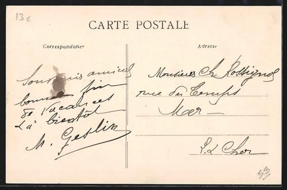 Personenbezogene Daten auf der Rückseite der Karte wurden durch blauen Textmarker unkenntlich gemacht. Die blauen Stellen sind auf die Vorderseite durchgeweicht und wirken sich negativ auf das Postkartenfoto aus