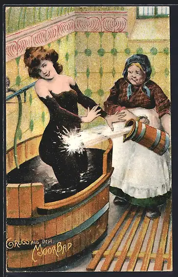 AK Moorbad, nacktes Fräulein wird vom Schlamm befreit