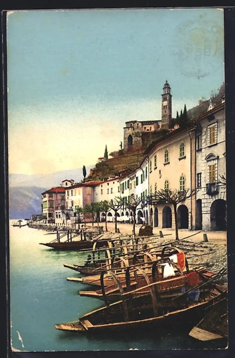 AK Morcote, Ortsansicht am Ufer mit Ruderbooten