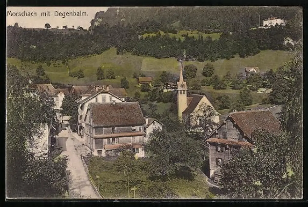 AK Morschach, Strassenpartie mit Kirche und Degenbalm