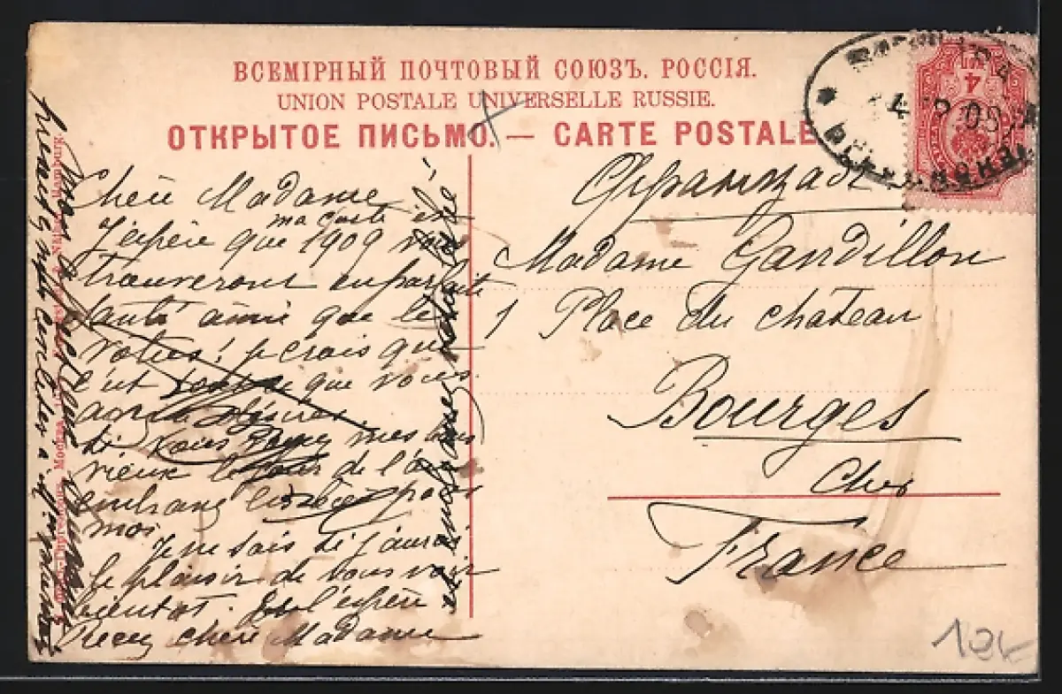 Personenbezogene Daten auf der Rückseite der Karte wurden durch blauen Textmarker unkenntlich gemacht. Die blauen Stellen sind auf die Vorderseite durchgeweicht und wirken sich negativ auf das Postkartenfoto aus