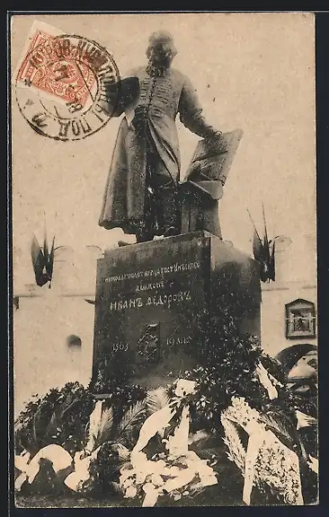 AK Moskau, Ivan Fjodorow-Denkmal mit Kränzen