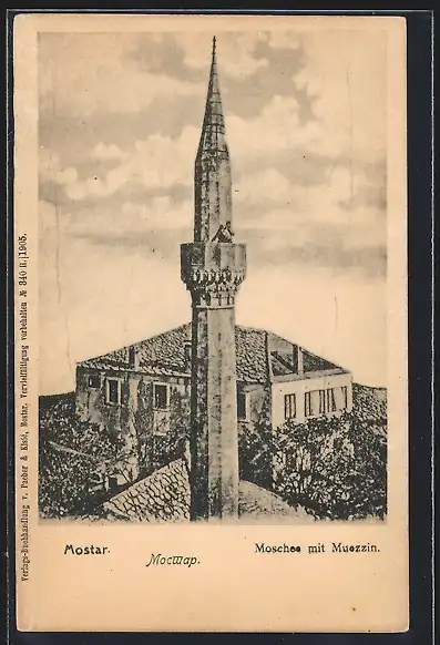 AK Mostar, Moschee mit Muezzin auf dem Minarett
