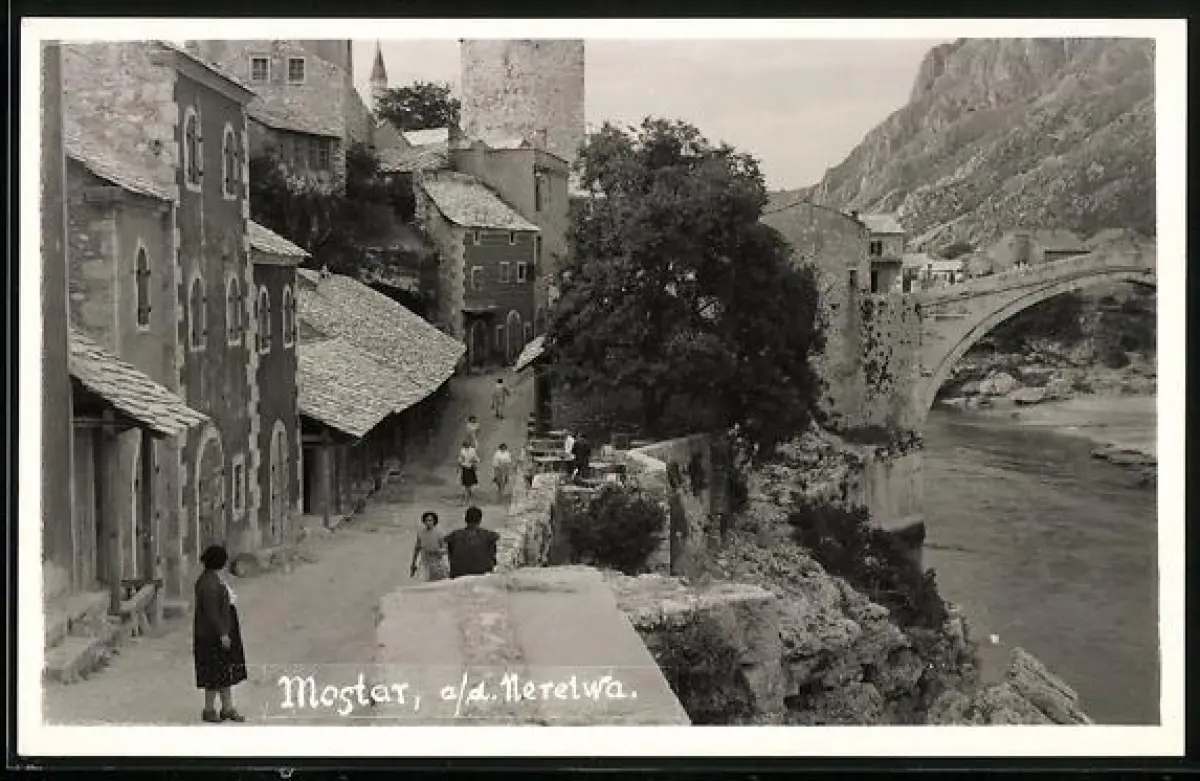 AK Mostar a. d. Neretwa, Strassenpartie mit Wohngebäuden und Bogenbrücke