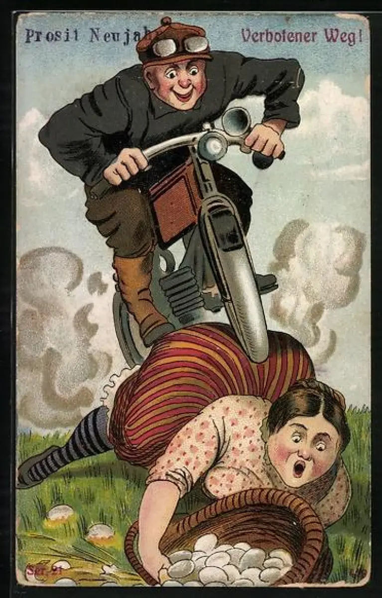 AK Motorradfahrer überfährt Frau mit Eierkorb
