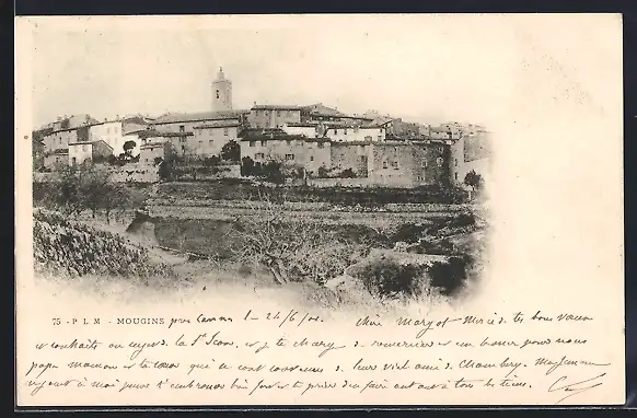 AK Mougins, Vue générale du village avec clocher en arrière-plan