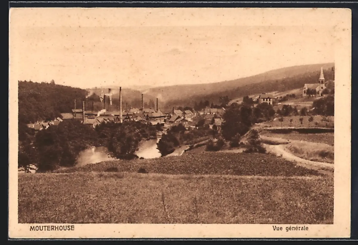 AK Mouterhouse, Vue générale du village et de l`usine avec collines en arrière-plan