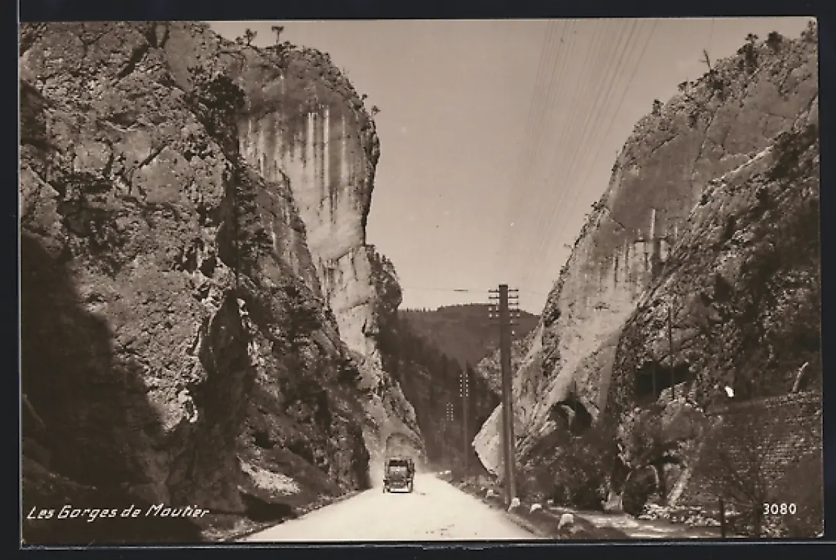 AK Moutier, Les Gorges de Moutier, Ortsansicht mit Automobil
