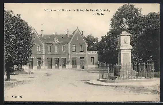 AK Mouy, La Gare et la Statue du Duc de Mouchy
