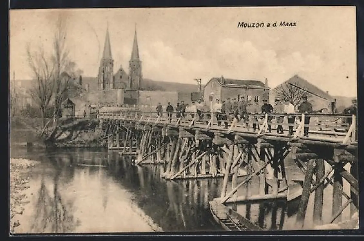 AK Mouzon, Pont en bois sur la Meuse avec vue sur l`église