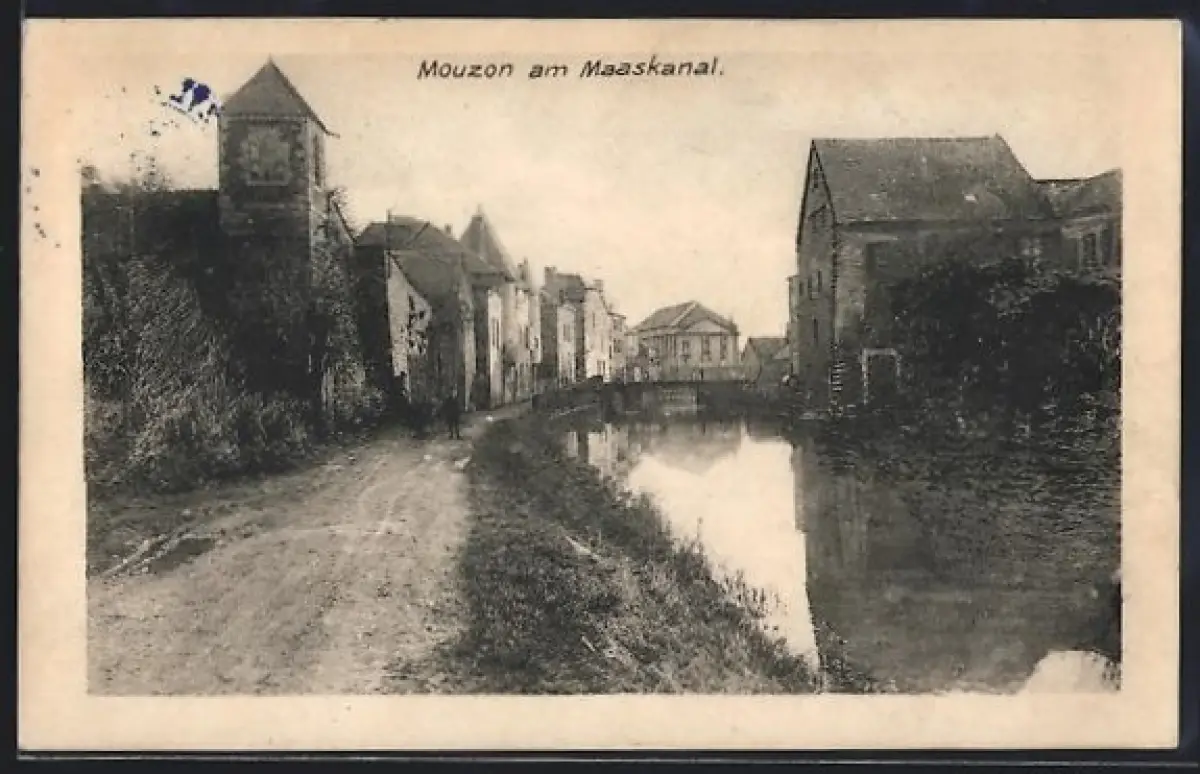 AK Mouzon, Vue sur le canal de la Meuse et les bâtiments adjacents