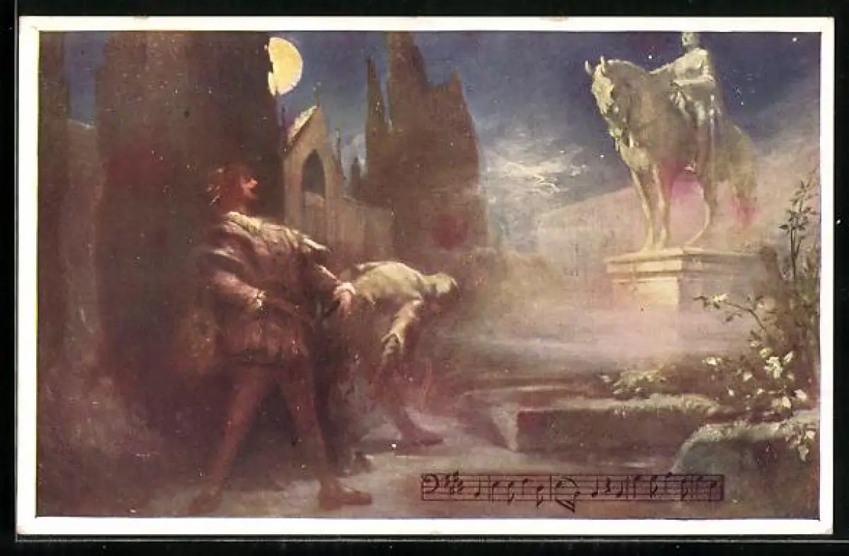 AK Mozart Don Juan, Herr Gouverneur zu Pferde, Männer vor einem Denkmal