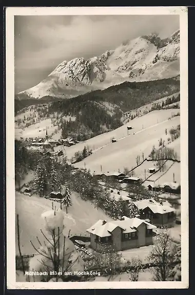 AK Mühlbach am Hochkönig, Ortsansicht vom Berg aus im tiefen Winter