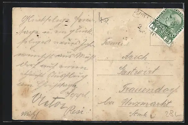 Personenbezogene Daten auf der Rückseite der Karte wurden durch blauen Textmarker unkenntlich gemacht. Die blauen Stellen sind auf die Vorderseite durchgeweicht und wirken sich negativ auf das Postkartenfoto aus