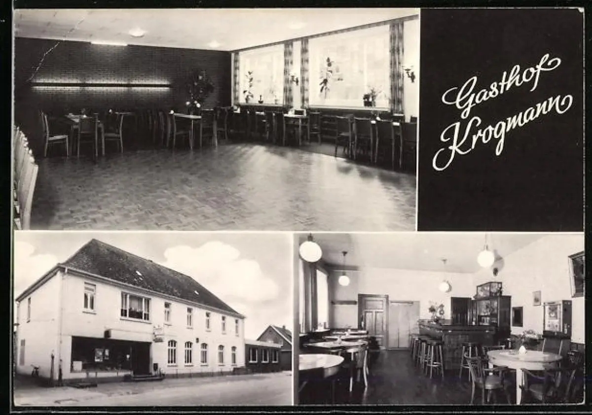 AK Mühlen / Oldenburg, Gasthof Krogmann, Aussenansicht, Gastraum, Saal
