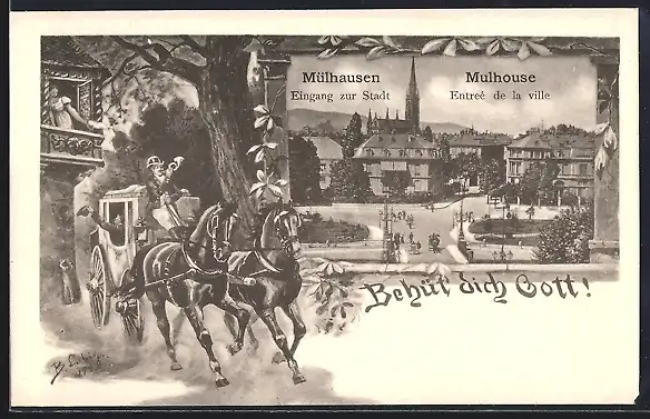 AK Mülhausen, Eingang zur Stadt, Postkutsche