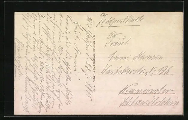 Personenbezogene Daten auf der Rückseite der Karte wurden durch blauen Textmarker unkenntlich gemacht. Die blauen Stellen sind auf die Vorderseite durchgeweicht und wirken sich negativ auf das Postkartenfoto aus