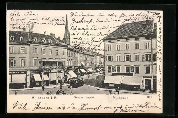 AK Mülhausen i. E., Neuquartierplatz mit Strassenbahn