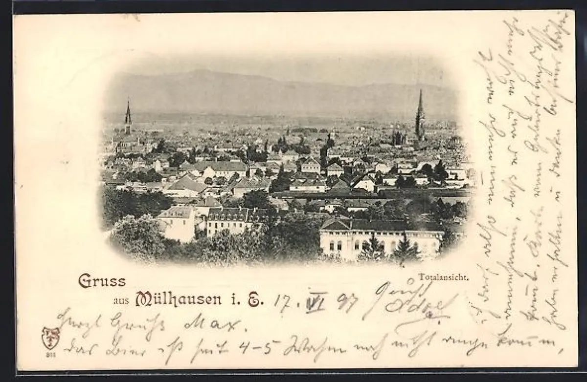 AK Mülhausen i. E., Vue générale de la ville avec clochers et collines en arrière-plan