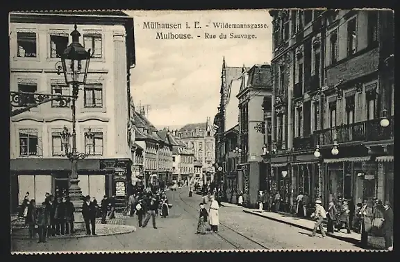 AK Mülhausen i. E., Wildemannsgasse mit Geschäften und Passanten