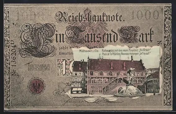 AK Mülhausen i. Els., Rathausplatz mit dem neuen Monument Die Arbeit, Ansicht im Geldschein
