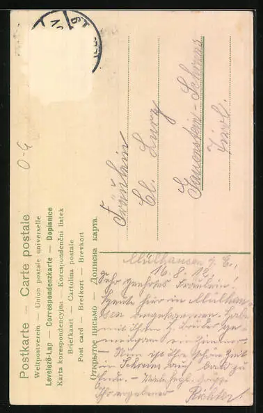 alte Ansichtskarte, gelaufen 1912, Briefmarke entfernt, rückseitig Oberflächenschaden, Bugspur re. oben, guter Zustand