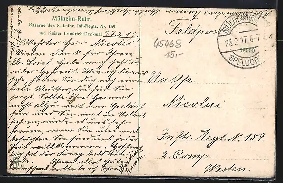 AK Mülheim, Kaserne des 8. Lothr. Inf.-Regts. Nr. 159 mit Kaiser Friedrich-Denkmal