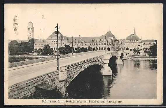 AK Mülheim-Ruhr, Schlossbrücke mit Stadtbad und Rathausturm