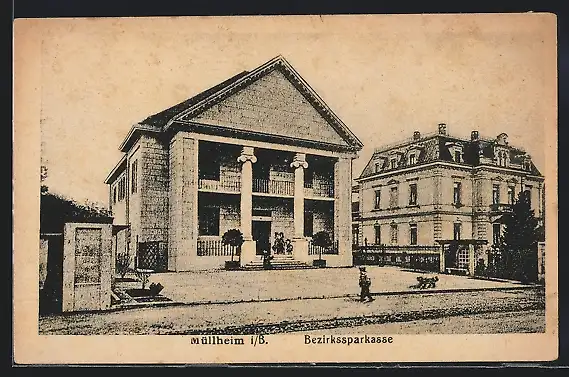 AK Müllheim i. B., Bezirkssparkasse mit Strassenpartie