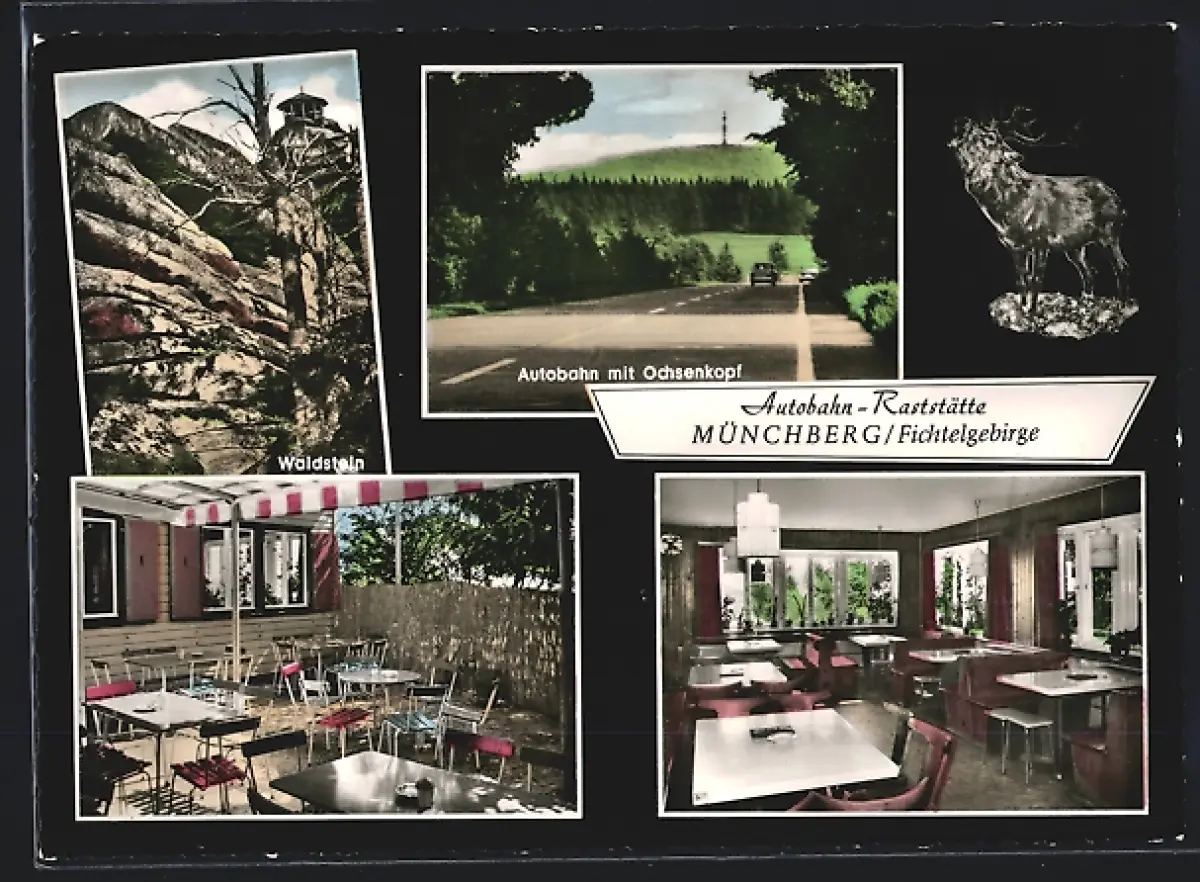 AK Münchberg /Fichtelgebirge, Autobahn-Raststätte, Waldstein, Autobahn mit Ochsenkopf