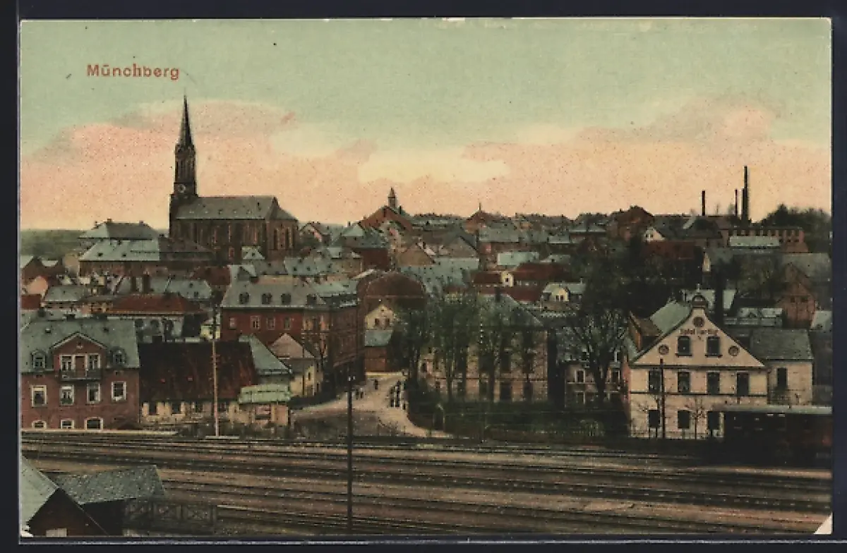 AK Münchberg, Ortsansicht mit Bahnschienen und Kirche