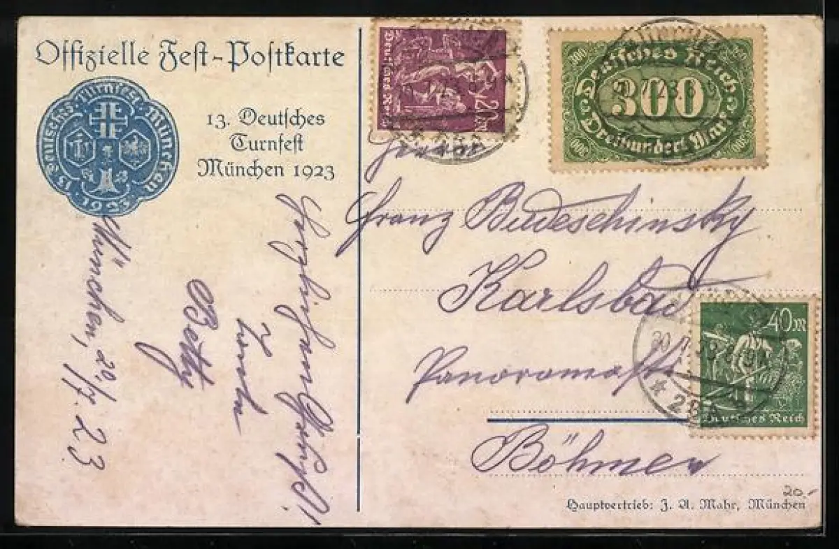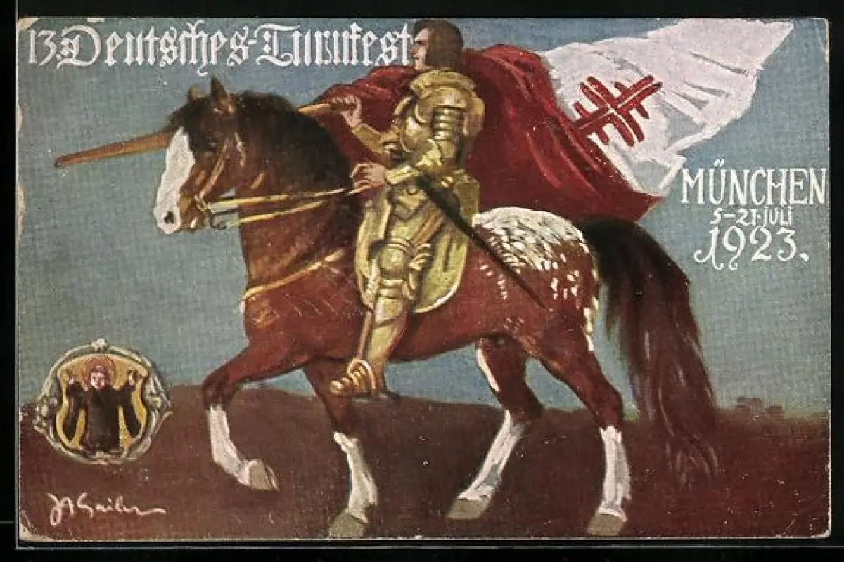 AK München, 13. Deutsches Turnfest 1923, Fahnenträger zu Pferd, Münchner Kindl