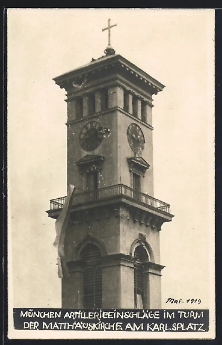 AK München, Artillerieeinschläge im Turm der Matthäuskirche am Karlplatz, Mai 1919