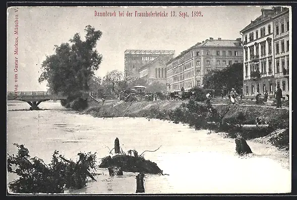 AK München, Dammbruch bei der Fraunhoferbrücke 1899, Unwetter