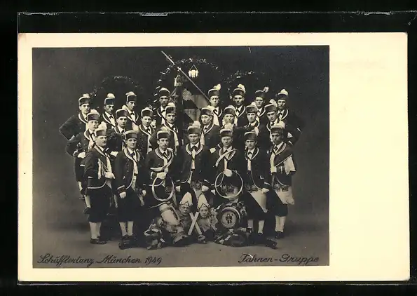 AK München, Der Schäfflertanz 1949 zur Erinnerung an das Erlöschen der Pest 1517, Fahnen-Gruppe