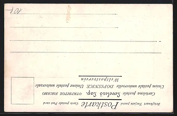 Personenbezogene Daten auf der Rückseite der Karte wurden durch blauen Textmarker unkenntlich gemacht. Die blauen Stellen sind auf die Vorderseite durchgeweicht und wirken sich negativ auf das Postkartenfoto aus