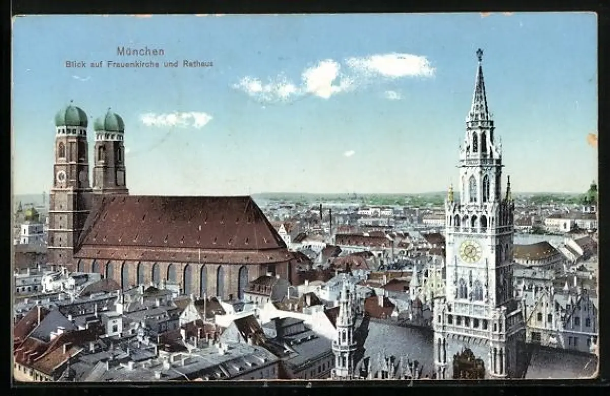 AK München, Frauenkirche und Rathaus mit Stadt aus der Vogelschau