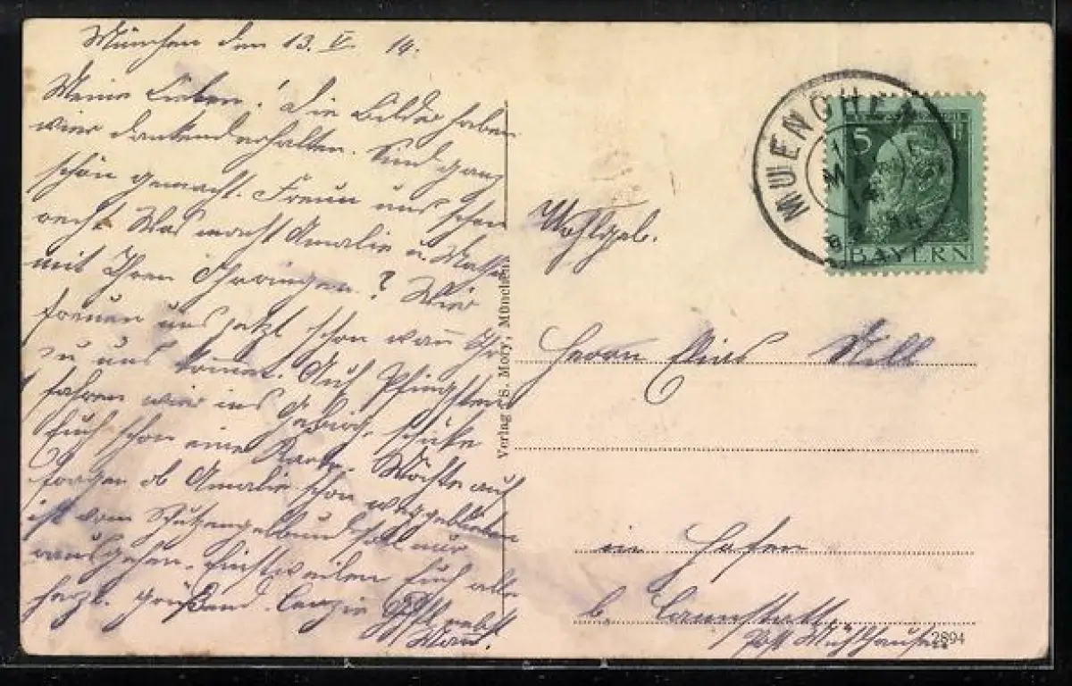 alte Ansichtskarte, gelaufen 1914, Abriebspuren oben u. re. oben, Eckknick unten re., Stempelspur, guter Zustand