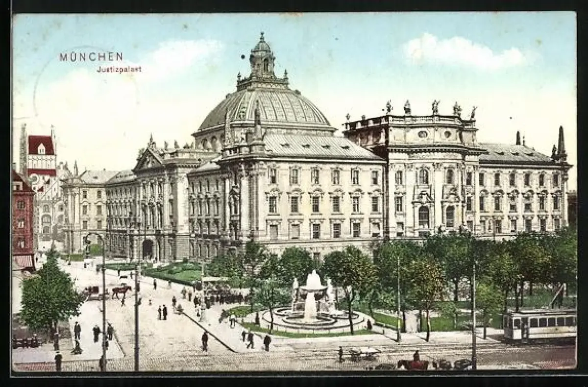 AK München, Justizpalast am Karlsplatz, Strassenbahn