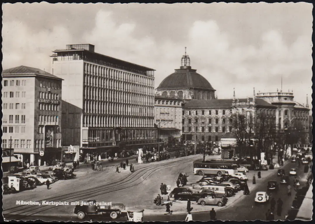 AK München Karlplatz, Werbe-Stempel München EINIGKEIT RECHT FREIHEIT 28.5.1955