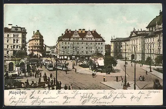AK München, Karlsplatz mit Strassenbahnen, von oben gesehen