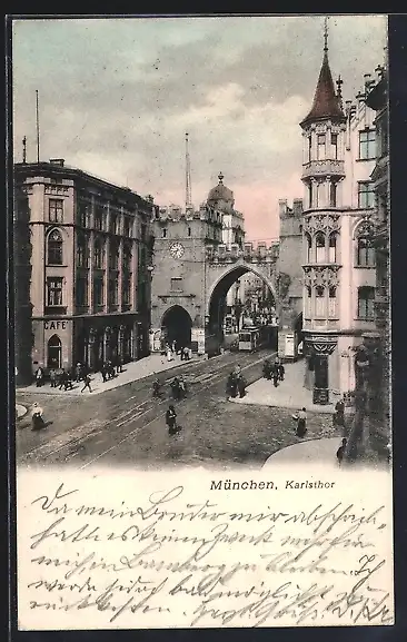 AK München, Karlsthor mit hindurchfahrender Strassenbahn