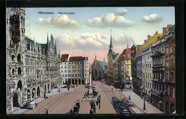 AK München, Marienplatz mit Strassenbahnen aus der Vogelschau