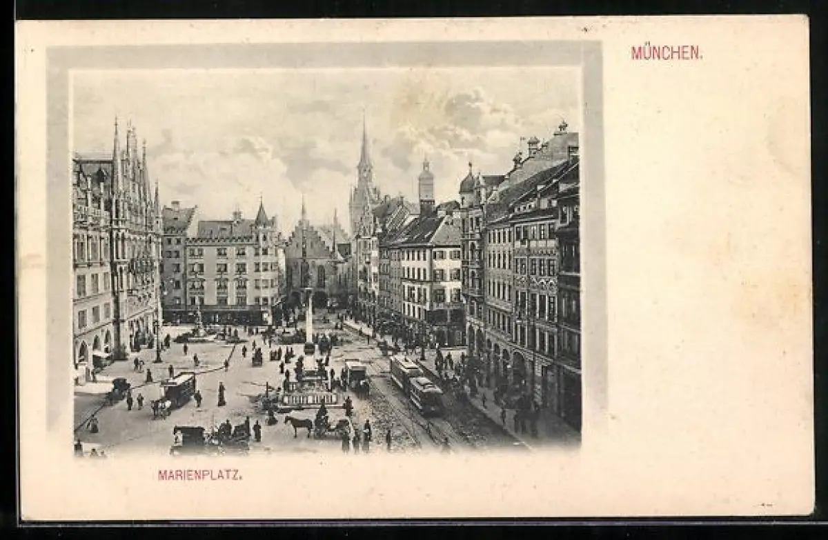 AK München, Marienplatz mit Strassenbahnen aus der Vogelschau