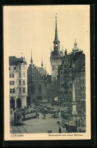 AK München, Marienplatz mit altem Rathaus und Strassenbahn